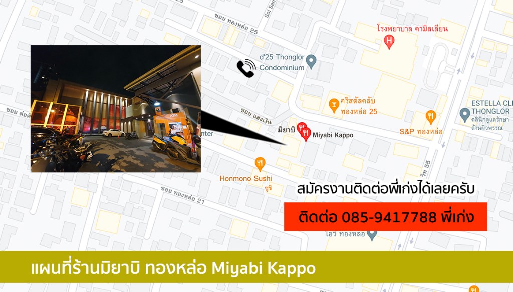 ร้านมิยาบิ ทองหล่อ Miyabi Club Kappo ร้านบาร์คาราโอเกะ อันดับ1 อยู่ที่ซอยทองหล่อ25 คลับญี่ปุ่นที่ใหญ่ที่สุด สะอาด ปลอดภัย หรูดีสุดในกรุงเทพ มีลูกค้าญี่ปุ่นมาเที่ยวมากที่สุดในกรุงเทพ สำหรับลูกค้าญี่ปุ่น ระดับซาโจ้เจ้าของกิจการ นักธุรกิจ ที่อาศัยอยู่ในกรุงเทพ ไม่มีคนไทยเที่ยว กิจกรรมหลังเลิกงานของคนญี่ปุ่นจะชอบมาร้องเพลง กินอาหาร พูดคุย สังสรรค์ ไม่เน้นดื่มเหล้า เพราะจะเที่ยวให้คลายเครียดจากการทำงาน มาเที่ยวเร็วและกลับเร็ว ก่อนตี1 ไม่ไหลยาว คนญี่ปุ่นสุภาพใจดี ทิปหนัก เที่ยวแบบมีมารยาท ไม่เสื่อมเสีย